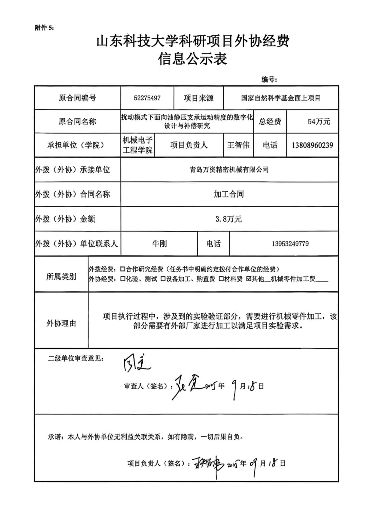 点击:根据《山东省人民政府办公厅印发关于进一步完善财政科研项目资金管理的若干措施的通知》(鲁政办字〔2019〕120号)以及《yl8cc永利官网科研项目与经费管理办法(试行)》(山科大发〔2020〕64号)相关规定,现对 王智伟 为项目负责人的 扰动模式下面向油静压支承运动精度的数字化设计与补偿研究 项目的外协经费情况进行公示,公示时间为 2025年9月18日~2025年9月25日(公示时间不少于5个工作日)。若对本项外协经费有异议,请于公示期内向机电学院或科技处反映并提交书面材料。
